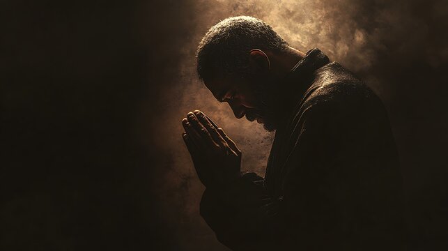 Devout man praying in a dark studio, head bowed, hands pressed together, with soft light breaking through the darkness to signify spiritual connection