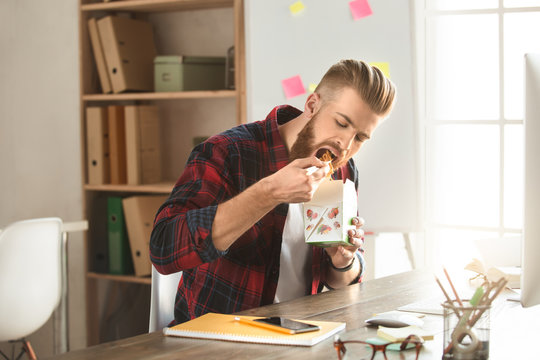 Young bearded man unpacking books from the box during his relocation to new house