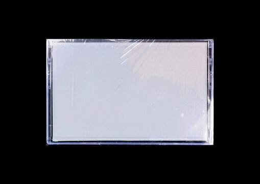 Old cassette tape case on black background. Isolated music transparent mockup. Clean cover box template.