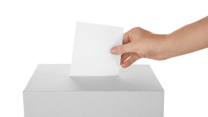 Female hand putting voting ballot into the box  on white background