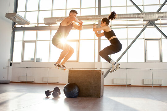 Beautiful sporty woman in sportswear jumping on wooden box in gym. Training, cross fit, sport