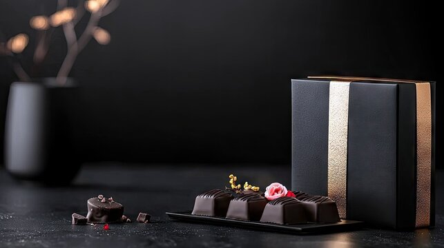 Close-up of assorted chocolate candies with a gift box on a dark table, elegant arrangement.