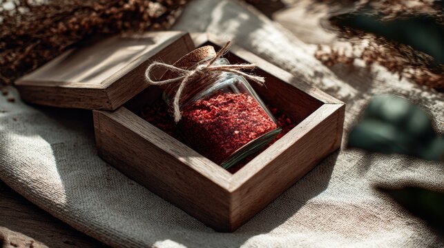 Heart shaped fabric in rustic wooden gift box on natural cloth for romantic setting