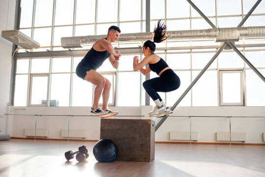 athletic couple in sportswear at crossfit training in the fitness room, woman and man together at fitness training jump