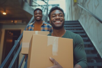 Women carrying large canvas through open front door during home move with boxes and sunlit entryway