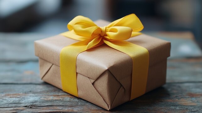 A neatly wrapped gift box with a yellow ribbon on a rustic wooden table outdoors