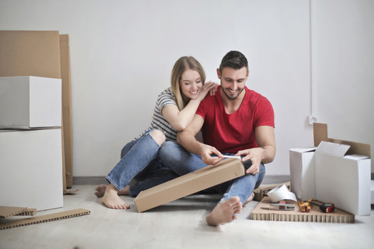 Bearded man resting on floor with beautiful woman, surrounded by cardboard boxes, communicating about furniture and home decorations. Happy relationship moments of caucasian homeowners on moving day.
