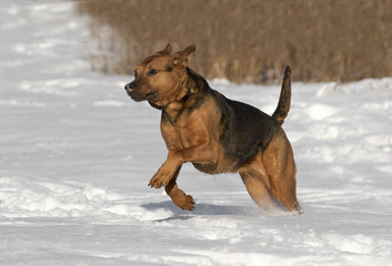 Dog breed boxer in winter field