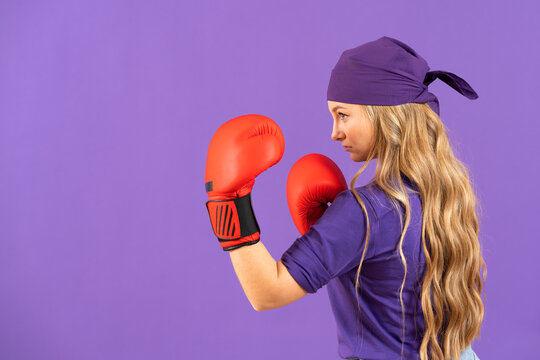 Portrait of sexy blonde boxer woman in red boxing gloves and grey sports bra  standing near blue punching bag with hands crossed near face