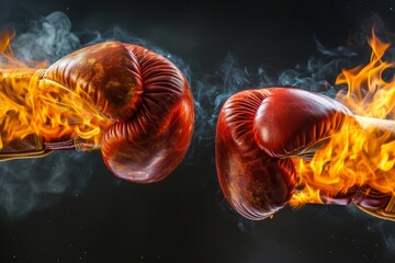 Opposing boxing gloves engulfed in flames on a black background