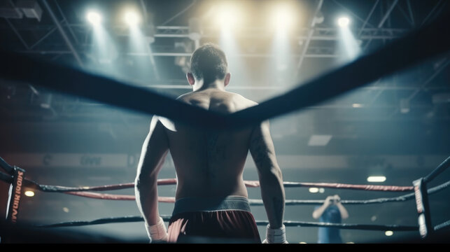 A dynamic view of an empty boxing ring illuminated by stage lights, perfect for sports promotions, event marketing, and athletic branding.