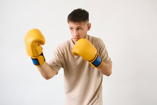 Determined man mastering self-defense techniques, practicing punches in sparring with young partner under guidance of senior coach at boxing gym