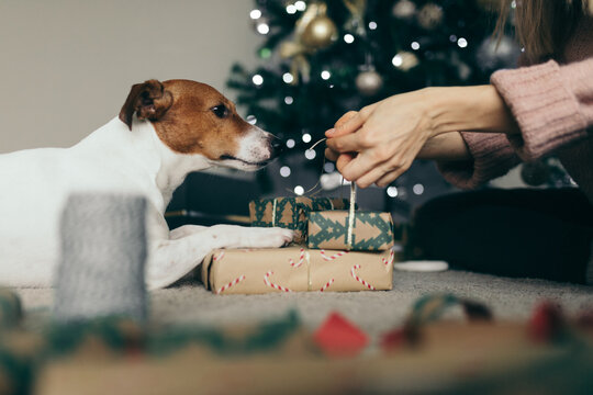 Couple moving into new home packing boxes, woman in box laughing while partner pushing, dog running
