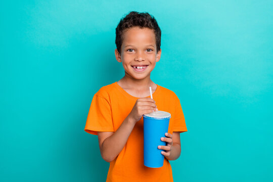 Photo of cute adorable little guy dressed orange t-shirt enjoying tasty drink isolated teal color background