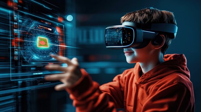 A boy wearing a VR headset interacts with a digital interface, showcasing immersive technology and virtual experiences.