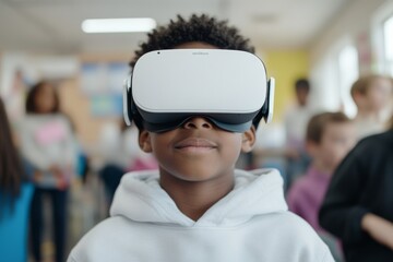 A young boy wears a virtual reality headset in a classroom, experiencing technology in an educational setting surrounded by peers.