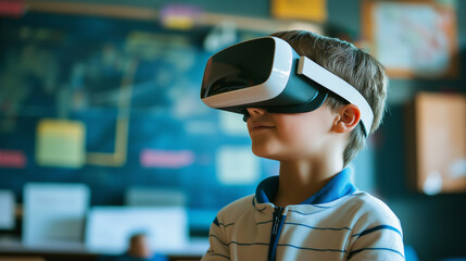 School pupil with VR headset using AI artificial intelligence technology for interactive learning in a classroom. The educational setting integrates machine learning and smart tech, Generative AI