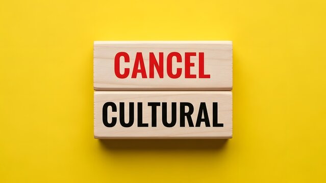 Wooden blocks spelling 'CANCEL CULTURAL' on a vibrant yellow background, representing the concept of cancel culture and societal discourse.