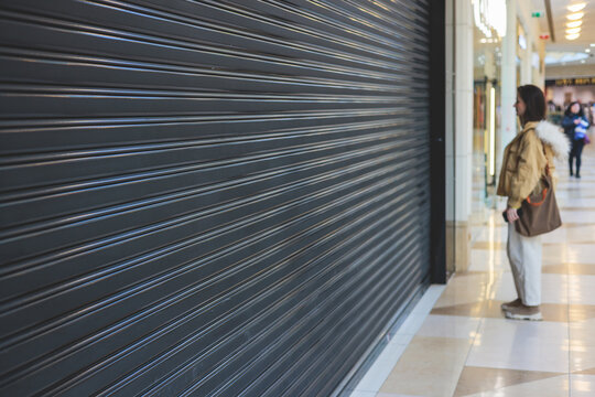 Stores show case in shopping mall closed due to sanctions, boycott and embargo, mass market cloth shops work stoppage with closed storefronts, retail business suspension and brands leaving market