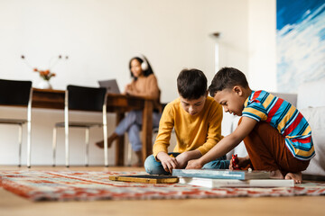 White two boys playing while sitting on floor in home