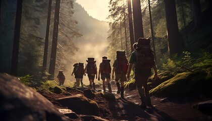 Scouts or tourists go with big backpacks on the green forest trail on sunny summer day. Active healthy lifestyle people with rucksacks. Hiking Trekking Scouting. Green forest background.