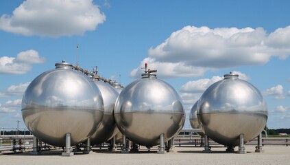Liquified Gas Storage Industrial landscape featuring spherical bpvc tanks in a blue-sky setting among oil refineries