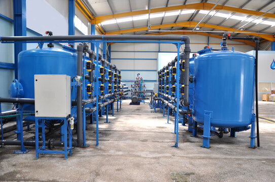 Stainless vertical steel tanks and pipes with pressure meter in equipment tank chemical cellar at the with stainless steel tanks