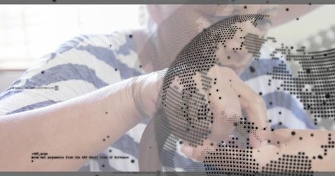 Holding senior wrist with bracelet caregiver leaning in sunlit space with digital globe overlay