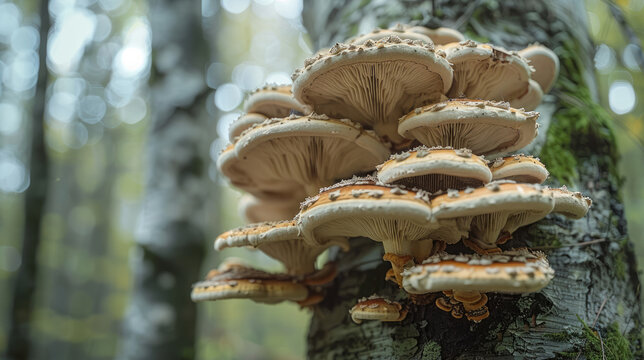 Close-up of bracket fungi growing on a tree trunk in a forest. Detailed textures of bark and mushroom layers, natural earthy colors, woodland ecology concept, decay and life cycle in nature.