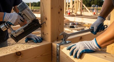 Two construction workers using a nail gun and wrench to build a wooden house frame outdoors.
