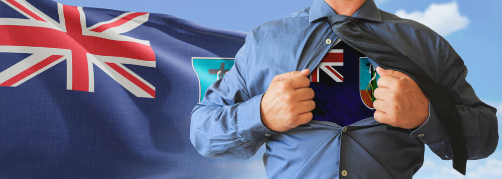 A businessman opening his shirt like super hero with Montserrat flag and shows how patriotic he is by revealing his countries flag beneath printed on a t-shirt.
