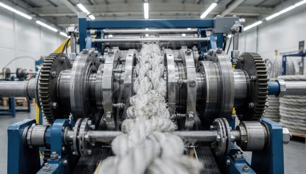 Medium shot of industrial braiding equipment manufacturing thick hawsers emphasizing robust construction and heavyduty line formation.
