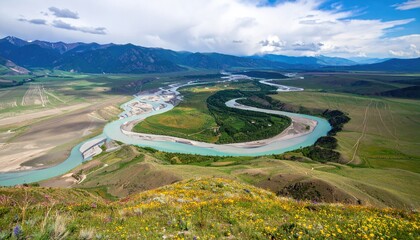 Stunning aerial view of a vast braided river delta carving through lush green plains under a clear blue sky