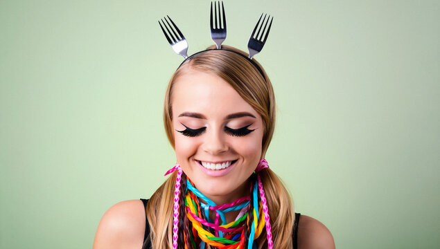 Portrait of Woman with Fork Headband and Braided Necklace
