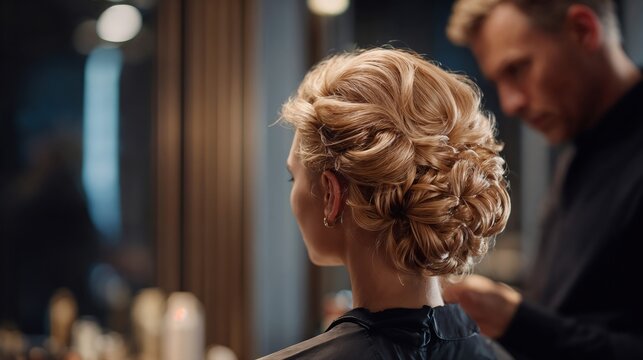 Hairdresser perfecting elegant updo in modern salon
