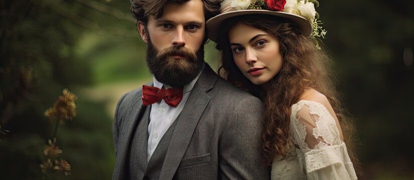 Stylish wedding couple posing in a portrait The image features a young bearded man wearing a hat and a brunette bride in an elegant gown with a braided wreath in her hairstyle Copy space image
