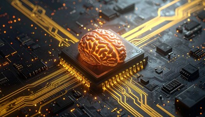 Glowing brain atop CPU on motherboard—yellow-orange light, circuitry detail—symbolizing intelligence, integration, and the neural rhythm of machine learning, cognition, and digital evolution.