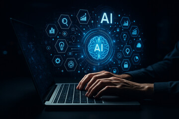 AI generated ultra realistic image of hands typing on a laptop surrounded by glowing AI holographic interface icons showing data security analytics and digital intelligence
