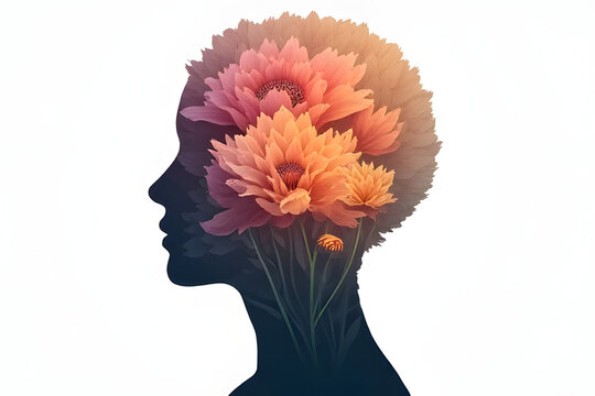 Mental health illustrations , happiness, harmony creative abstract concept. self care idea. Happy woman head with flowers inside. Mindfulness, positive thinking