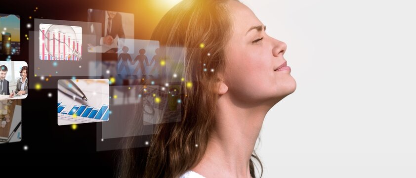 Woman sleeping with glowing brain hologram symbolizing dreaming