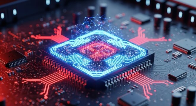 Circuit board with a glowing AI brain icon in the center on a blue and black background.