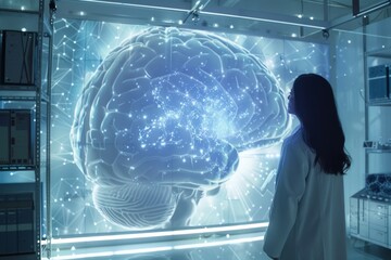 Exploring the frontiers of neuroscience with advanced technology and illuminated brain projections in a futuristic lab. Generative AI