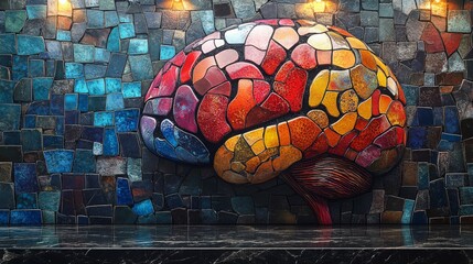 Colorful mosaic brain mural displayed on a vibrant wall in a creative workspace