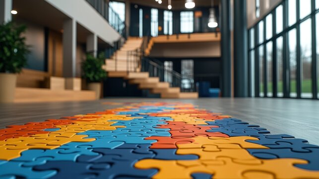 A colorful jigsaw puzzle in vibrant hues of orange yellow blue and dark blue laid out on the floor of a modern spacious building lobby with