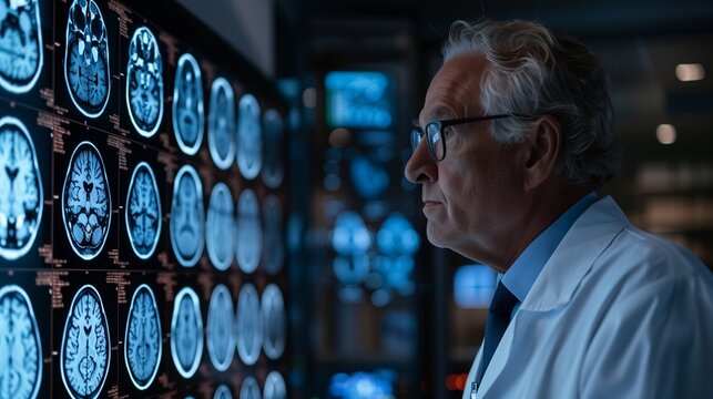 Brain disease diagnosis with medical doctor diagnosing elderly ageing patient neurodegenerative illness problem seeing Magnetic Resonance Imaging (MRI) film for neurological medical treatment