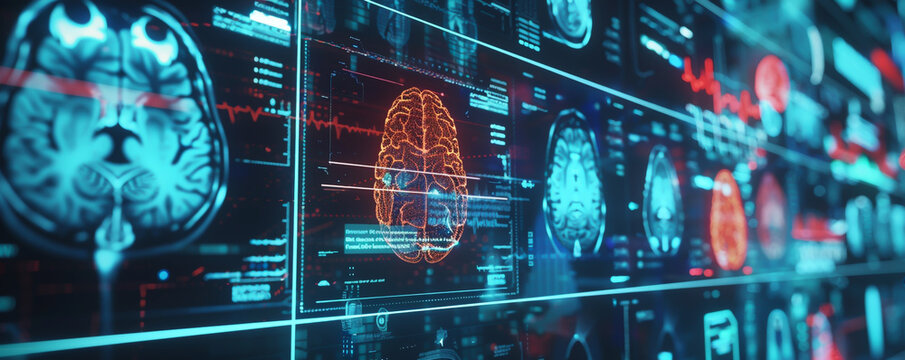 Holographic brain connecting to glowing test tubes visualizing neural dataflow and ai
