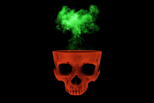 Digital photo collage a skull open at the top. Red skull and green smoke on black background.