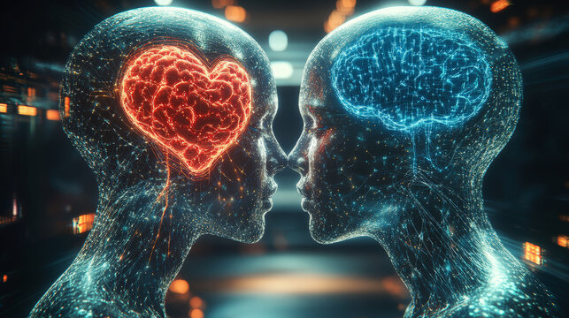 Digital figures face each other, one with a heart and the other with a brain, symbolizing the balance between emotion and intellect in a glowing setting.