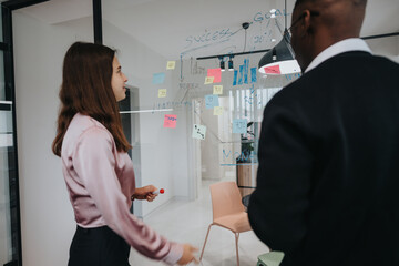 Creative team collaborative brainstorming with sticky notes on transparent board