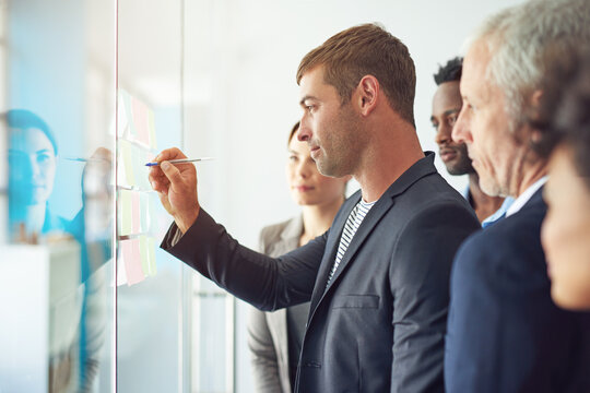 Businesspeople in brainstorm, thinking and planning session in a modern office. Creative team sharing ideas and strategy for collaboration at the workplace. Business people at work with sticky notes.